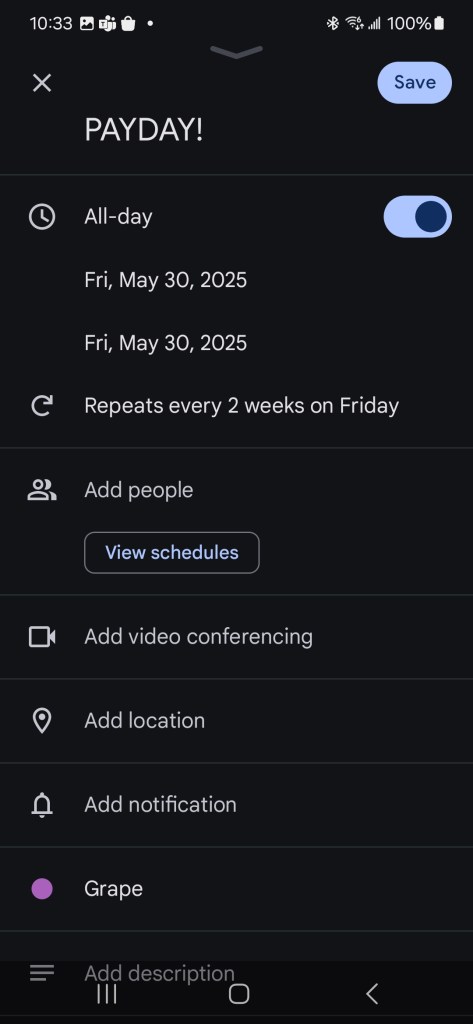 With the above method in mind, keep adding your bills. Remember to setup the recurring event so they fill up your calendar. At first I only added my utilities, insurance, car payments. As I got better at budgeting I began adding smaller repeating costs like my daughter’s allowance (great reminder). Finally, for those annual bills like Water & Sewer and Property Taxes I began breaking down how much it would be per pay. This makes the cost much less scary and attainable. For example, I’m invoiced aprox $220 every 3-months for W&S so I broke it down into bi-weekly payments of $35. With this method I actually got ahead of the bill over the years and I’m usually an entire 3 months ahead.