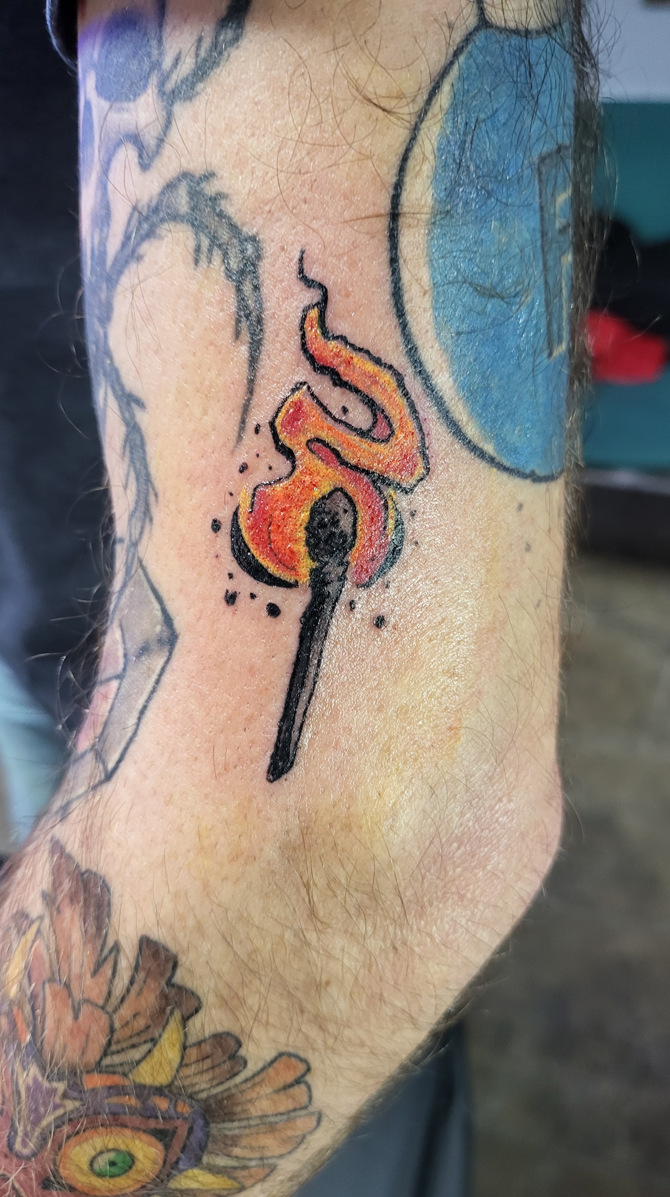 Fast forward to the afternoon. I’ve dropped her off at a high-school football game with her friends. I take a deep breath, be brave man, and head back over. Long story short, I hit it off the with the artist, Matt, and got this little match stick free-handed. I love it and expect I’ll be returning to him for several more new skool pieces.